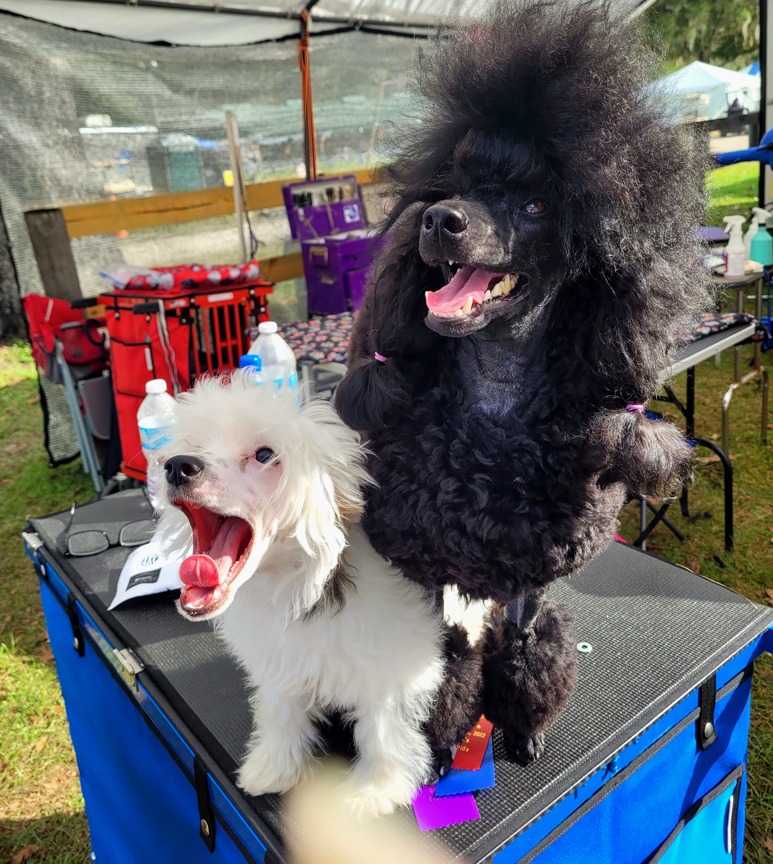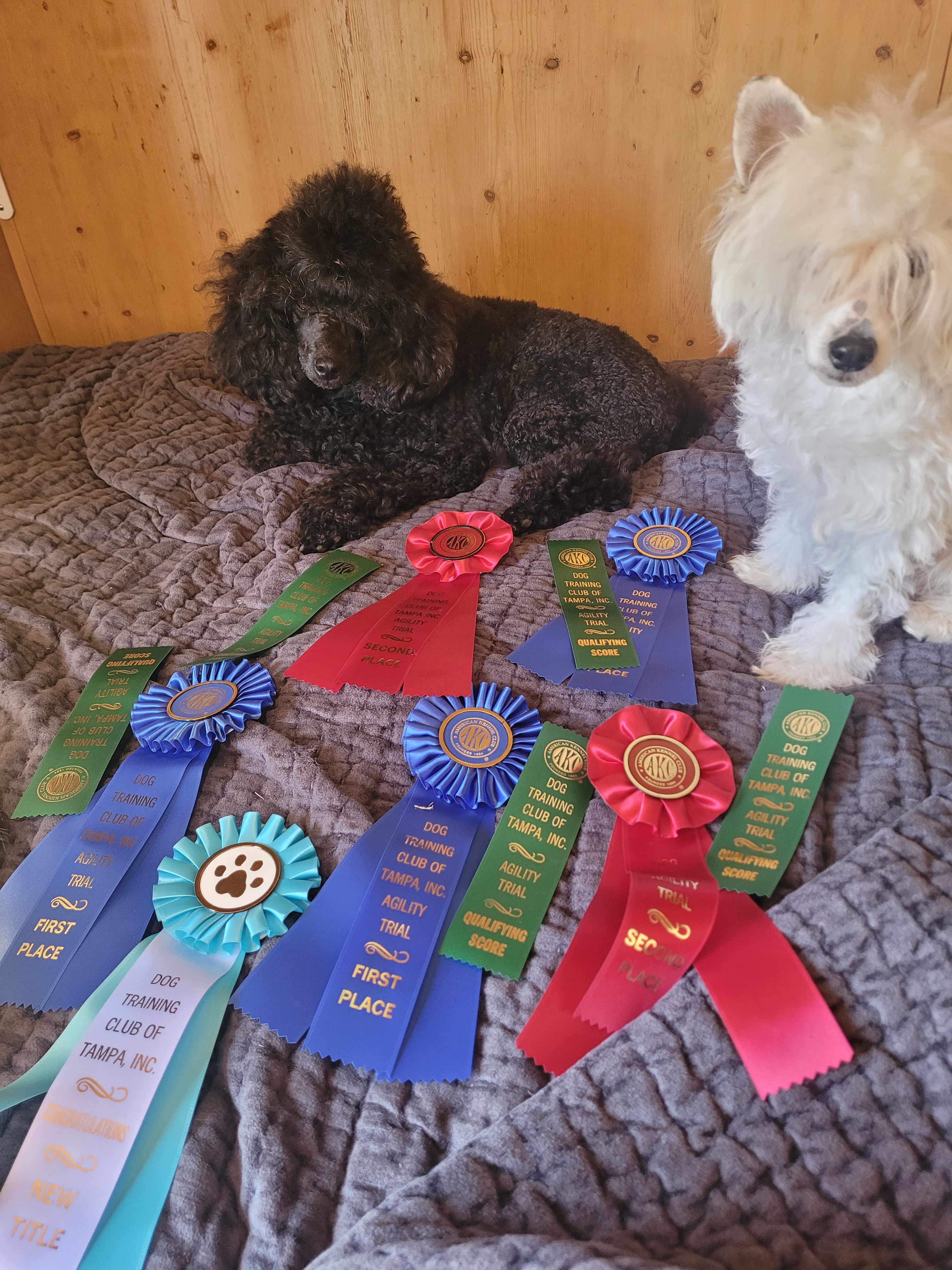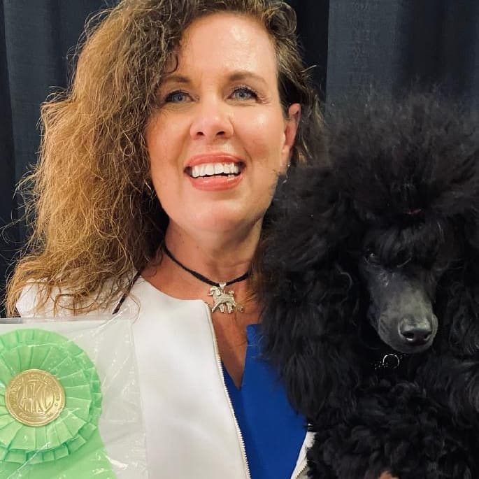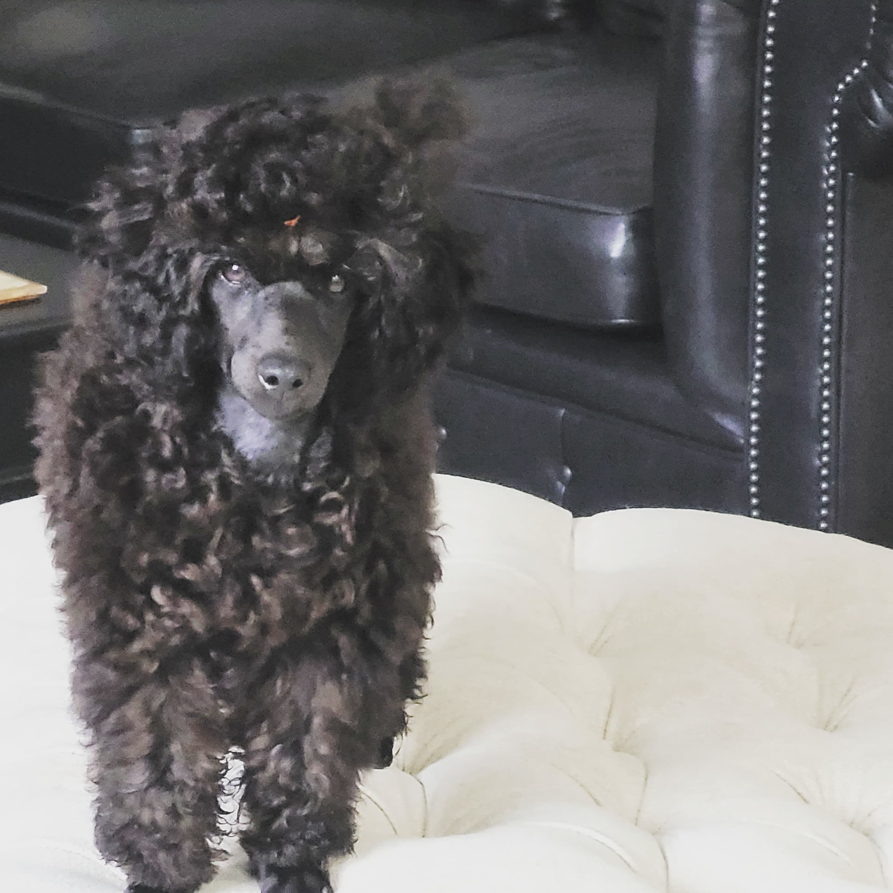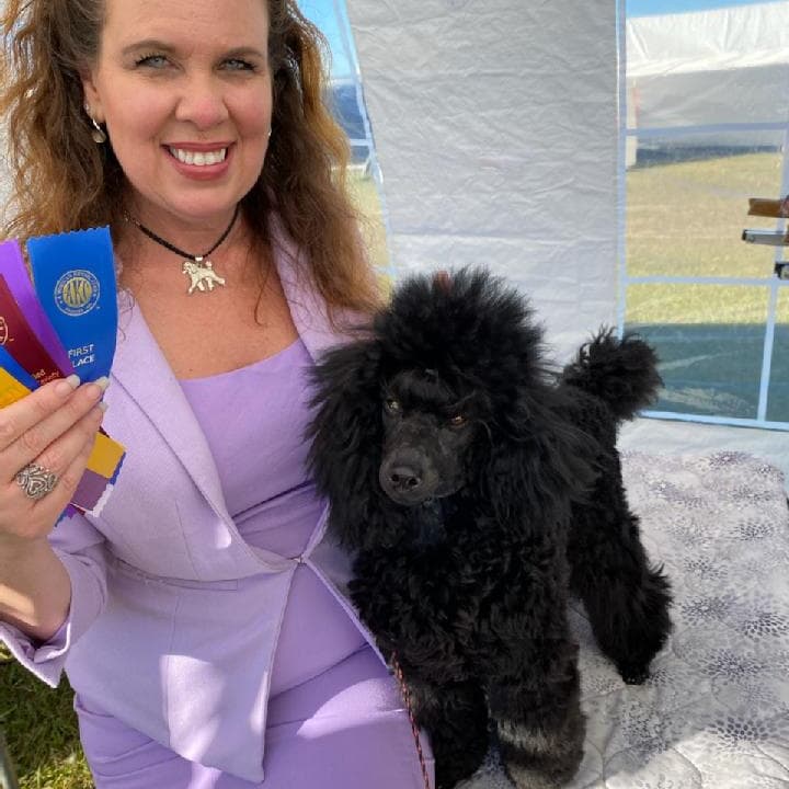 Midnight is the queen at our house. She is the first one to greet everyone at the door. Loves her toys, especially her ball 🙂 My husband and her are inseparable, and are currently competing in agility now that she has completed her conformation Championship, and is now competing in Excellent Agility class after only being out for 6 weeks!. She is also a full sister to the #1 Agility poodle “Kyze”.
